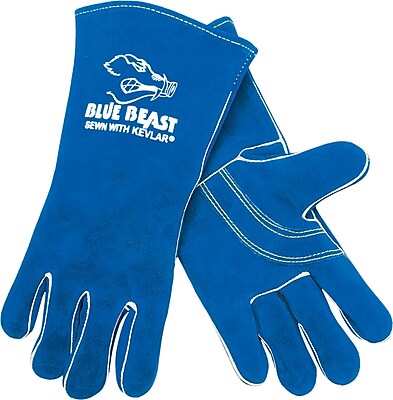 All cow blue select side leather welders gloves made in a gunn pattern. the palm and thumb strap are reinforced. all seams are fully welted and sewn with kevlar. there is a one piece back with “blue beast” logo. the cuff liner is flame resistant. 6 dozen are packed per case. ... Read More